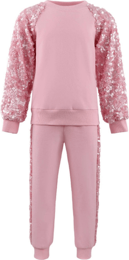 Stylish pink jogger set featuring dazzling sequin sleeves and side panel details for a standout look Soft, breathable fabric with ribbed cuffs and hem for a comfortable and flattering fit Perfect for adding a touch of sparkle to everyday outfits while staying effortlessly chic