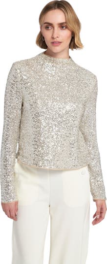 Fully embellished with shimmering sequins for a bold, eye-catching evening statement piece. Smooth polyester lining ensures comfort while wearing, preventing scratchiness from the sequins. Classic mock neck silhouette adds an elevated, sophisticated touch to any outfit. Subtle stretch in the knit offers a flexible, body-skimming fit without restriction. Clean, minimal finish along the hem and cuffs keeps the look modern and sleek. Ideal for festive gatherings, special events, or dressing up a simple look instantly.