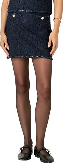 Shimmery sequins highlight the hems and decorative pockets of this enchanting floral-lace miniskirt.