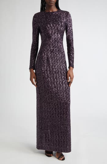 Thousands of light-catching sequins bring statement shimmer to this elegant figure-hugging gown designed with a back slit for ease of movement.