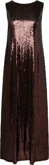 - Featuring a straight boatneck, this maxi dress is cut for a boxy, pullover fit with low sleeve openings and sequins that glitter all over, down to its floor-length hem. Unlined Boat neck Low armhole Boxy fit Pull on 100% Polyeste Dry clean only.
