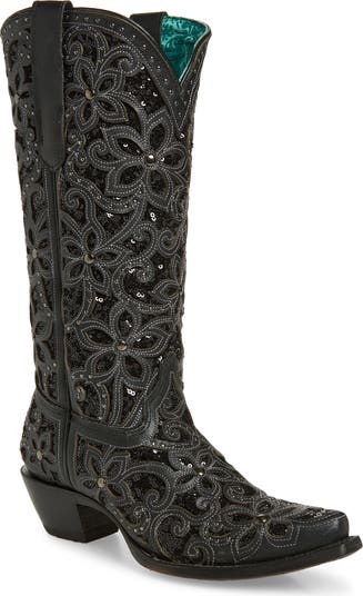 Shiny sequins and intricate overlays define a fashion-forward Western boot that's crafted from crackled leather and kept comfortable with plush cushioning and arch support.