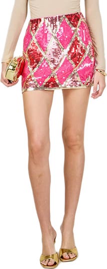 Lustrous sequins in an elegant diamond design enhance the allure of this leggy-length skirt that's primed for a party.