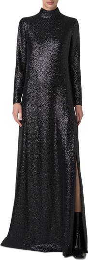 Countless sequins lend a feeling of enchanted elegance to this sweeping gown that intentionally toys with the duality of light and shadow. Long sleeves and a high side slit both conceal and reveal.