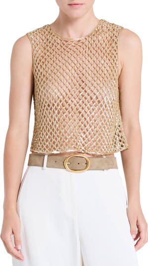 Lustrous sequin netting adds eye-catching allure to this cropped sleeveless top.