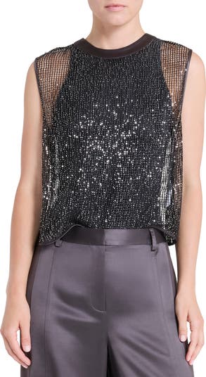 A relaxed open-stitch tank is knit in a sleeveless silhouette with smooth satin trim and glitzy allover sequins for a shimmering night-out look.
