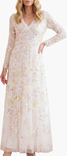 The Sequin Paradise V-Neck Gown. Showcasing colourful floral sequin embellishment inspired by blooming summer gardens, this V-neck gown creates an elongated, elegant silhouette. The artwork gently disperses towards the hem, enhancing the fluid full-length skirt.