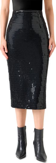 Shimmering sequins stitched across airy mesh reimagine the pencil skirt as a luminous column, tracing clean lines that skim the waist and hips then catch light with every step.