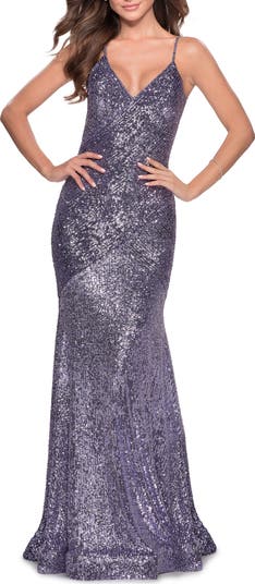 Trendy sequin evening gown with cool drop waist detail and V shaped neckline. This design is complete with a criss cross open back. Back zipper closure.