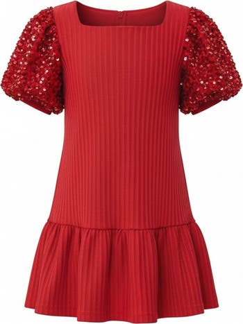 Make her holiday moments shine in this chic and festive puff sleeve dress designed for sparkle, comfort, and style.