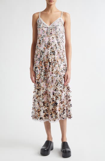 Bespoke bedazzling makes a simple slipdress into a statement piece of eveningwear with its mix of patterns overlaid with sequins and its rhinestone-studded lace trims.