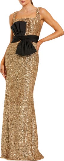 Sequin evening gown with square neckline and oversized bow waist detail, perfect for galas, weddings, and glamorous red carpet events.