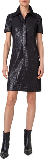 Tiny open-circle sequins blanket this shimmery shirtdress topped with a point collar and trimmed with satiny piping.