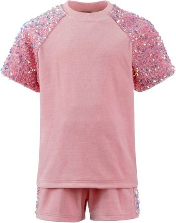 A charming two-piece set featuring a soft pink top with dazzling sequin-adorned sleeves and matching shorts with side sequin details. Designed for comfort with a relaxed fit and breathable fabric, making it perfect for stylish, everyday wear or special occasions. A playful and sparkly ensemble that adds a touch of glamour to any outfit.