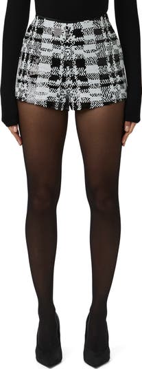 Lustrous sequins elevate these patterned night-out shorts cut in a leggy length.