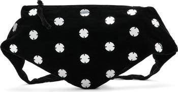 Bold and lustrous sequins illuminate the exterior of a geometric shoulder bag featuring a slouchy profile and suspended from a knotted strap.