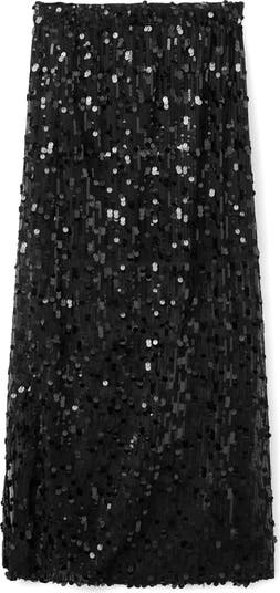 This party-ready lace skirt left sheer from the thigh down is asparkle in a web of dark sequins.