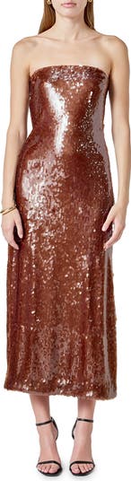 Dazzling sequins cover every inch of this fitted strapless gown that's sure to turn heads in every room you enter.