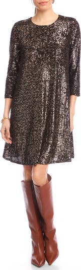 Add a shimmering swing to dress day in this sparkling frock framed by three-quarter sleeves and detailed with a keyhole at the back neckline.