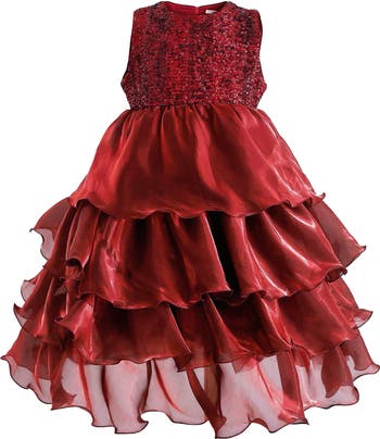 Make a statement in this vibrant dress, perfect for parties and special occasions that call for a touch of glamour. The shimmering sequin bodice and cascading organza tiers come together in a bold and festive silhouette. Sequin-embellished bodice sparkles with rich, jewel-toned radiance. Layered ruffled organza skirt adds dynamic elegance and volume.