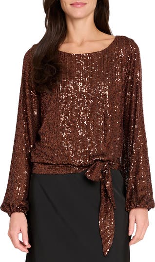 Light-catching sequins bring dazzling drama to this tie-hem top framed by billowed sleeves.