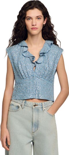 Striped sequin crop top with a ruffled V-neckline and a tie fastening at the front.