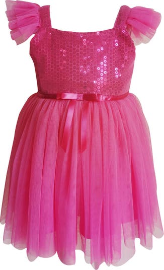 With its frothy tulle skirt, fluttery sleeves and a sequined bodice, this vibrantly hued party dress is perfect for your little cutie.