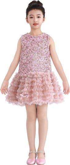 Make her moment sparkle in this dazzling dress, designed for birthdays, weddings, and all things twirl-worthy. The bodice glistens with multi-tonal sequins, while the voluminous tulle skirt adds a dreamy finish.