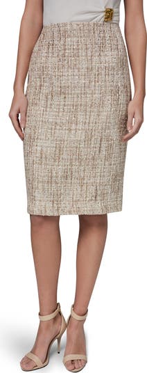 A pencil silhouette and workday tweed add classic elements to this day-to-night skirt updated with twinkling sequins.