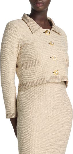 Scattered sequins and metallic stripes bring subtle shimmer to this three-quarter-sleeve jacket crafted of a twill knit and finished with jewel-like buttons.