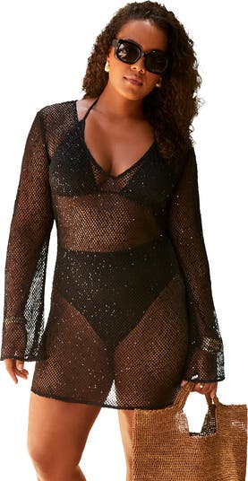An effortless glam look like this cover up is the move to make for a beach day that goes beyond sunset. It’s crafted from delicately crocheted fabric that has a weight as light as a whisper, with a smattering of sequin-like accents that give it a slight shimmer. Then there’s the plunging V-neckline, flared long sleeves, and a short body skimming silhouette that makes it look absolutely smashing.