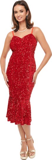 This delightful wiggle dress is crafted in a marvelous knit blend the shimmers with sequins throughout. Featuring a mermaid silhouette with adjustable spaghetti straps and a faux rose boutonnière. Complete with a back zipper.