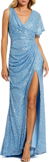 Draped sequin gown with ruched detailing, a cape sleeve, and a thigh-high slit. A bold, glamorous look perfect for formal evening occasions.