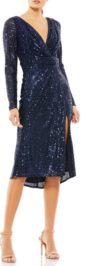 This long sleeve sequined midi dress features a faux wrap bodice, V-neckline, and a draped skirt with a daring front slit, combining glamour and effortless style for any event.