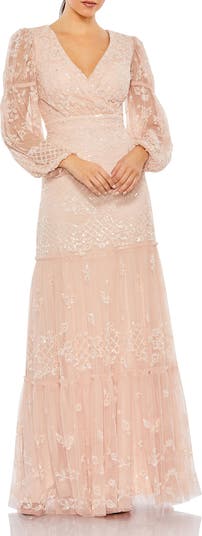 Sequined Tiered Wrap Over Puff Sleeve Gown