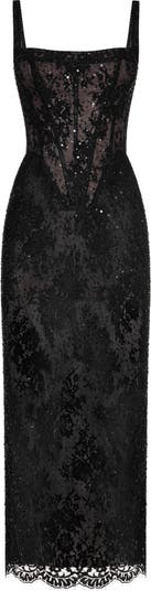 A magnetic statement of elegance, this black Chantilly lace corset dress shimmers with light-catching sequins. The structured bodice with wide straps offers supportive shaping, while the timeless maxi silhouette is finished with a scalloped lace hem for classic refinement. A lace-up back ensures a customizable fit, and a central back slit adds graceful movement, making it an effortlessly luminous choice for any height.