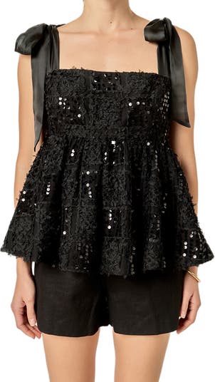 Satiny bows drape the shoulders of this square-neck tank adorned with dazzling sequins and finished with a flouncy hem.