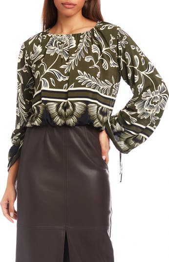Ruching and self-ties let you customize the sleeve silhouette of this floral printed crepe top designed with a gathered neckline.