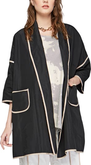 A mid-length kimono duster in memory taffeta featuring dropped shoulders, three-quarter sleeves, and binding tape details for a modern, architectural outer layer.
