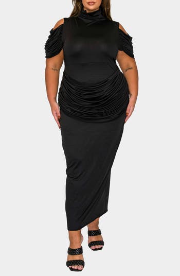 Cold-shoulder cutouts at the sleeves bring a sassy touch to this curve-skimming maxi dress designed with ruched details and a chic turtleneck.