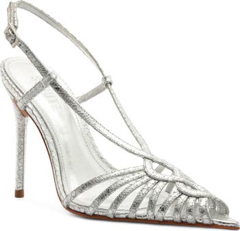 Shiny metallic leather shows off the subtle snakeskin embossing of this pointy-toe sandal set on a lofty stiletto heel.