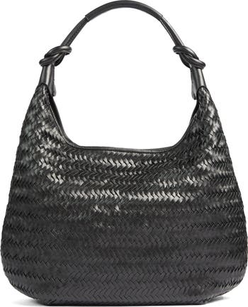 Handwoven strips of leather add striking texture to the front of this supple leather tote topped with a knotted shoulder strap.