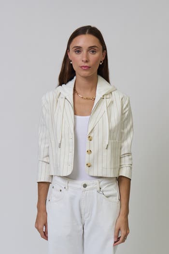 Achieve a layered aesthetic without the bulk in this pinstriped cropped jacket. With a built-in hoodie insert and button details, it combines a tailored silhouette with relaxed comfort for a modern edge.