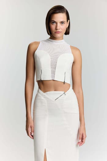 This top features a sheer mesh mock neck and structured bustier. Its unique denim-linen blend and front zippers create a versatile, modern silhouette.