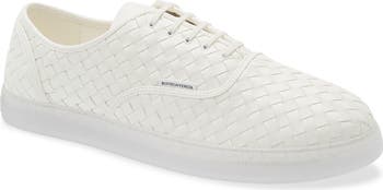 The label's house-signature intrecciato weave textures this low-profile sneaker crafted from rich Italian leather and set on a transparent rubber sole.