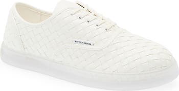 The label's house-signature intrecciato weave textures this low-profile sneaker crafted from rich Italian leather.