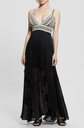 Enter the tropics in this billowy maxi dress that has beautiful embroidery on the bodice and a flirty lace-up back inspired by corset styles.
