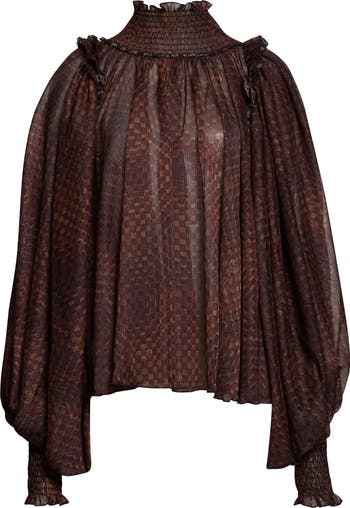 This swingy, sheer chiffon top fashioned in an oversized fit and designed with ruffle-topped balloon sleeves is printed in a subtle geo-check pattern shot through with fine metallic stripes. Rooted in the vibrant spirit of Istanbul, the Siedrés collection is inspired by childhood memories under the Mediterranean sun.