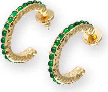 These earrings are a luxurious expression of elegance and craftsmanship. Each pair featuring a distinctive molten texture that adds a contemporary, artistic flair to the classic hoop design. The hoops are adorned with semi-precious gemstones such as nano-emeralds, rubys, and blue spinels, each chosen for their vibrant color and exceptional brilliance. Designed with both style and comfort in mind, the Serena earrings are medium-sized, providing a striking yet versatile look suitable for any occasion.