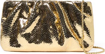 A metallic finish illuminates the snakeskin embossing of a stunning leather clutch furnished with a slim chain strap for styling versatility.